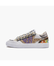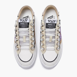 Tênis box de couro, mix de materiais e cores, detalhe de strass no cadarço, solado de borracha.
