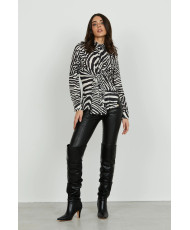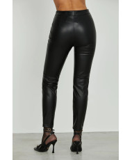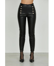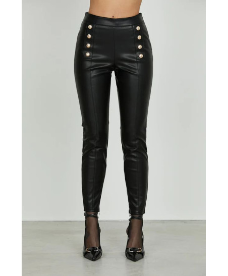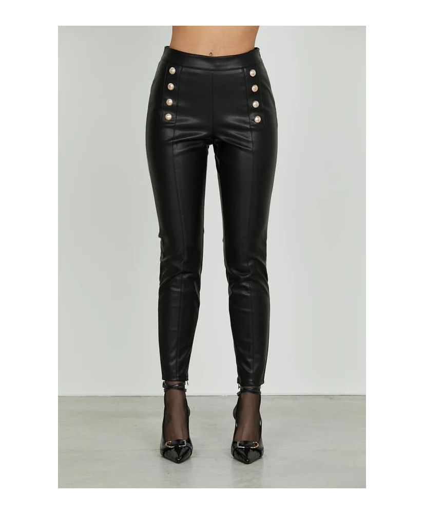 Calça de ecopele com cintura alta, fecho de zíper e botões decorativos.