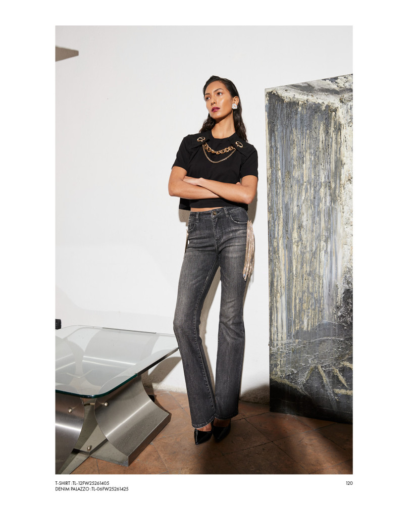 Jeans de Ganga Preta com Aplicações nos Bolsos (amovíveis).