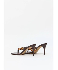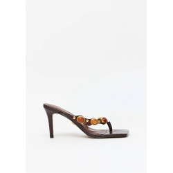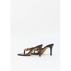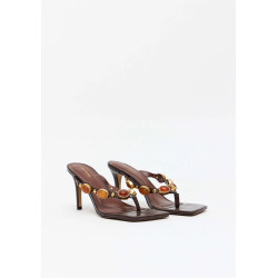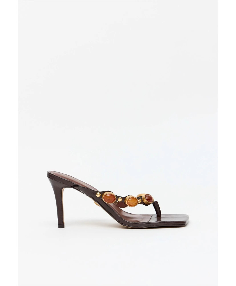 A sandália feminina em couro com salto fino e design flip flop traz sofisticação ao visual com pedras exuberantes e metais dourados. A palmilha macia e o bico quadrado atualizam a proposta.