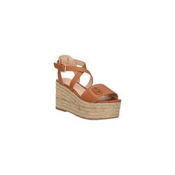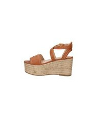 Sandália de couro marrom com salto de 8,5 cm e plataforma de 4,7 cm.