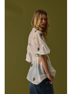 Blusa com manga de 3/4 com punho elástico, decote em V. Modelo fluido com tira de apertar na cinta. Detalhe de flores bordadas.