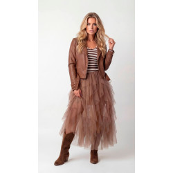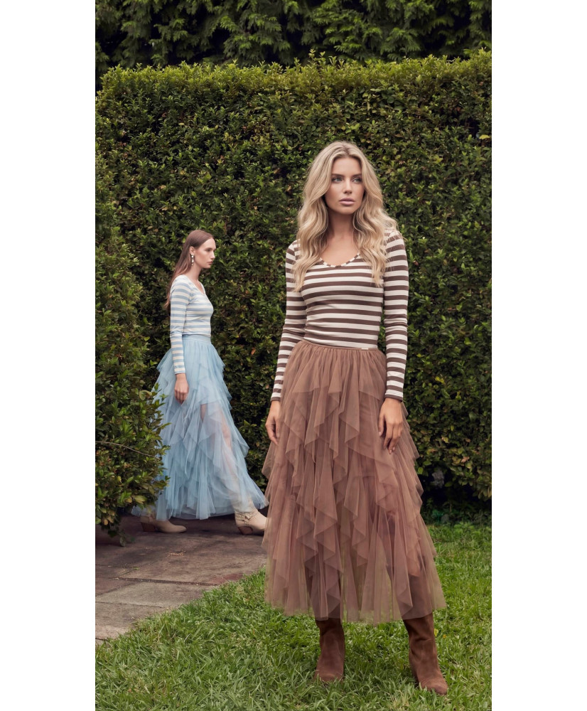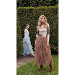Saia comprida em tule com folhos em camadas e efeito de volume. Cintura elástica.