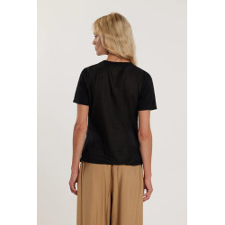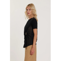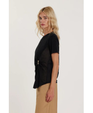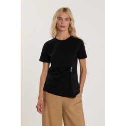 Camiseta Firsty de mangas compridas com pregas laterais e logo derramado assimétrico em strass, um modelo moderno e refinado. A peça estrutura a silhueta, enquanto a aplicação de strass adiciona brilho e um toque de moda único. Ideal para um look contemporâneo elegante e sofisticado.