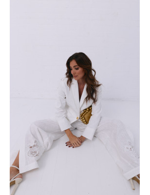 Calças em linho com bordado e racha na terminação