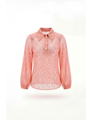 Blusa em renda com lapela e manga comprida, que combina delicadeza e sofisticação. Destaca-se pelos punhos com elástico e pelas golas em tecido acetinado no mesmo tom, criando um contraste subtil e elegante. Fecho frontal com botões madrepérola.