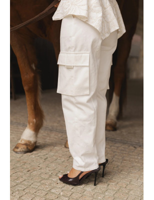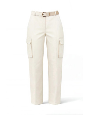 Calças confeccionadas em tecido principal de algodão, que aliam conforto e versatilidade. Apresentam cintura média com presilhas e cinto incluído, permitindo um ajuste personalizado. Os bolsos frontais e o bolso de chapa com aba na perna acrescentam um toque utilitário à peça. O fecho frontal garante praticidade no uso diário.